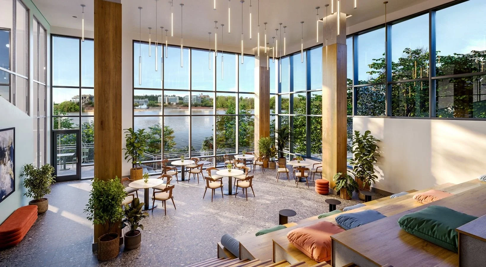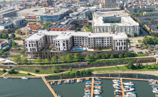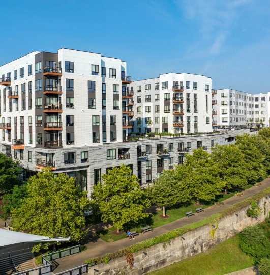 DESCRIPTION: The Park at Southside Works is an eight-story, 246-unit mixed-use apartment building with integrated amenity spaces and a lower-level parking structure. A third-floor two-way concrete slab serves as the structural podium supporting four levels of wood-framed construction above. The development features a rooftop pool at the podium level and provides views of the city skyline, surrounding hills, and the river.